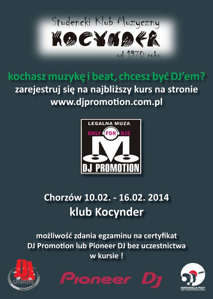 211220132013-12-21By piotrIn Komisja Egzaminacyjna Najbliższy Egzamin planowany jest na dzień 16 luty 2014r. w Klubie Kocynder w Chorzowie. Egzamin ten będzie również finałem kursu DJ-a, który rozpocznie sie 11 lutego 2014 r. O szczegóły musicie pytać organizatora kursu.