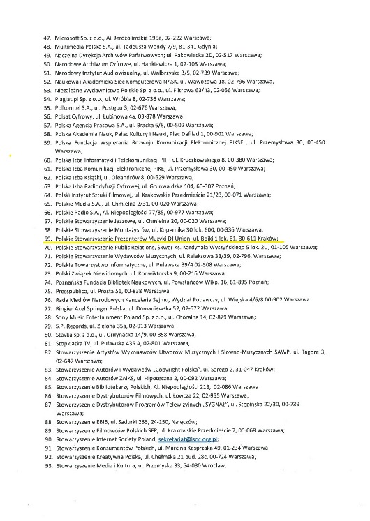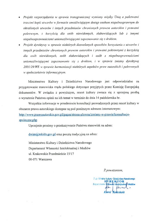 Ministerstwo Kultury i Dziedzictwa Narodowego zaprosiło również członków naszego Stowarzyszenia do udziału w konsultacjach społecznych dotyczących modernizacji prawa autorskiego. Ministerstwo Kultury i Dziedzictwa Narodowego jest odpowiedzialne za przygotowanie stanowiska rządu polskiego dotyczącego przyjętych przez Komisję Europejską dokumentów. W związku z powyższym, resort kultury zwraca się z uprzejmą prośbą o wyrażenie również opinii DJ-ów na ich temat w terminie do dnia 14 października br. W związku z powyższym prosimy o przesłanie swoich uwag do dnia 10 października tak abyśmy zdążyli przygotować i przesłać odpowiedź do MKiDN.