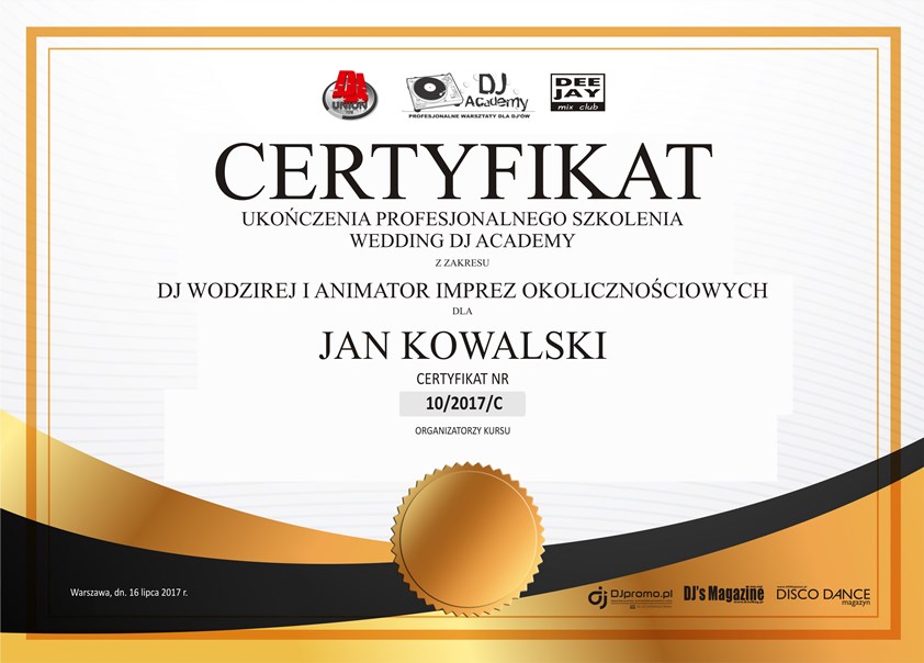 Świadectwem ukończenia tego Kursu jest Specjalny Certyfikat zabezpieczony wytłoczeniami, firmowany przez cenione na rynku marki i firmy jak: DeejayMixClub i DJ Union.